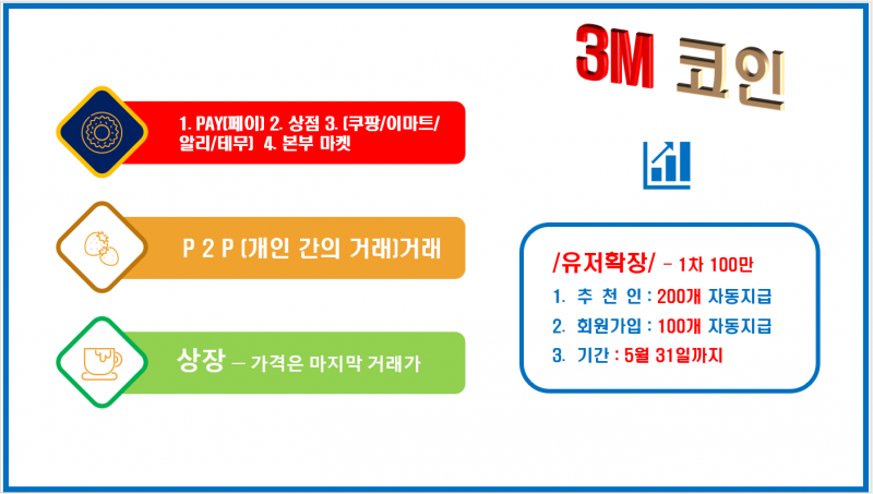 3. 3M 코인은 쿠팡, 이마트, 알리, 테무, 본부 마켓 등 온라인 쇼핑몰에서 사용할 수 있게 할 예정입니다.